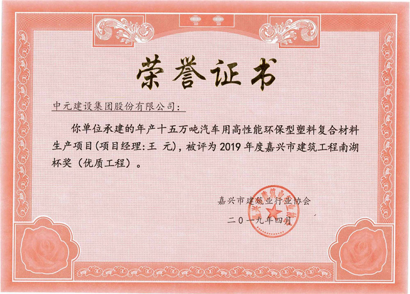 2019年度嘉兴市建筑工程南湖杯奖(优质工程)年产十五万吨汽车用高性能环保型塑料复合材料