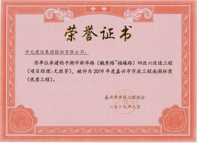 2019年度嘉兴市市政工程南湖杯奖(优质工程)平湖市新华路(毓秀路至福臻路)四六改造工程