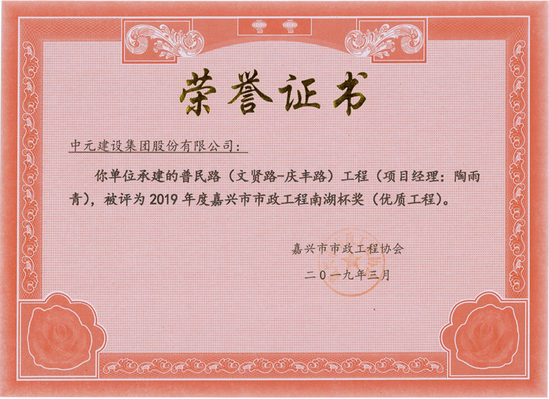 2019年度嘉兴市市政工程南湖杯奖(优质工程)普民路(文贤路至庆丰路)工程