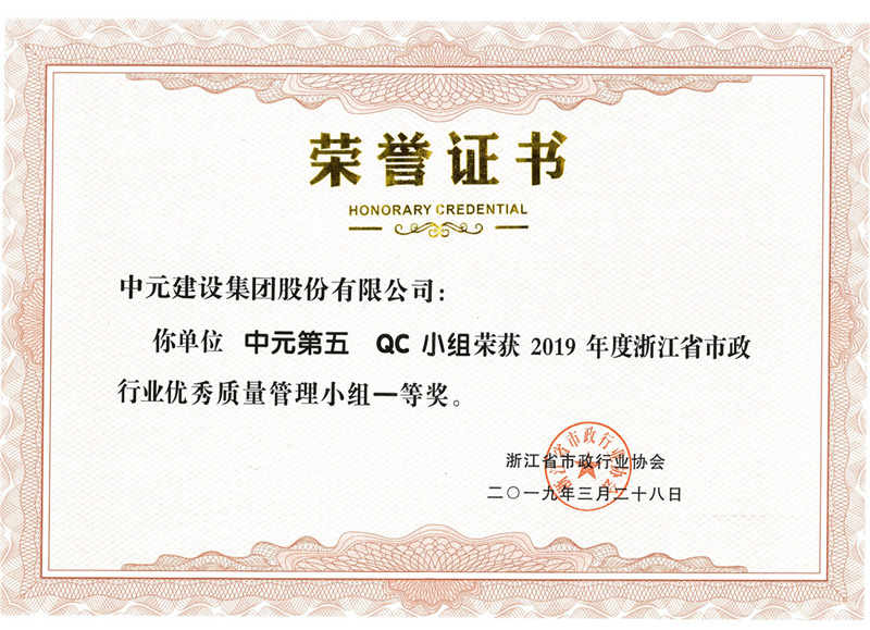 2019年度浙江省市政行业优秀质量管理小组一等奖(PA视讯第五QC小组)