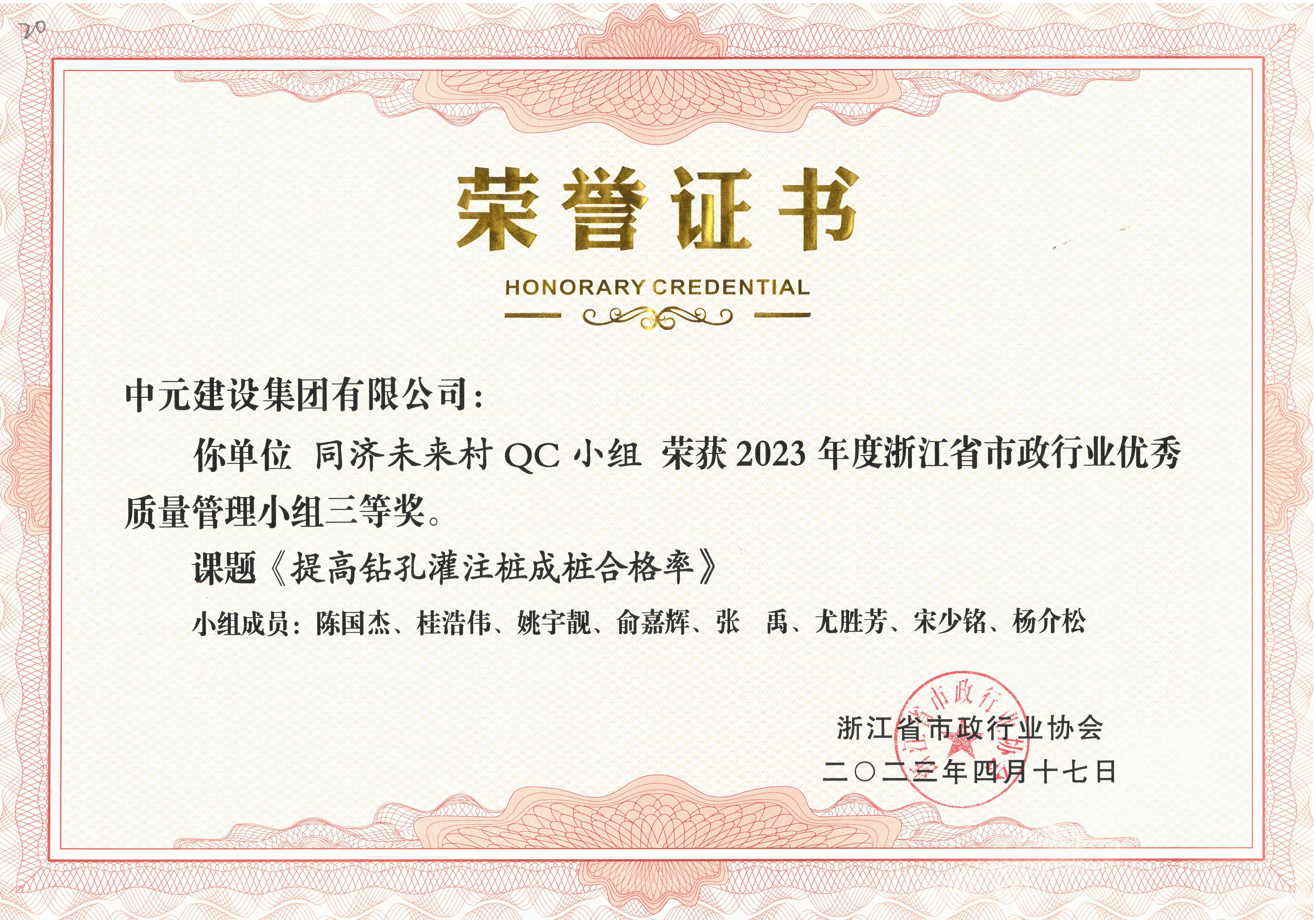 2023年度浙江省市政行业优秀质量管理小组三等奖