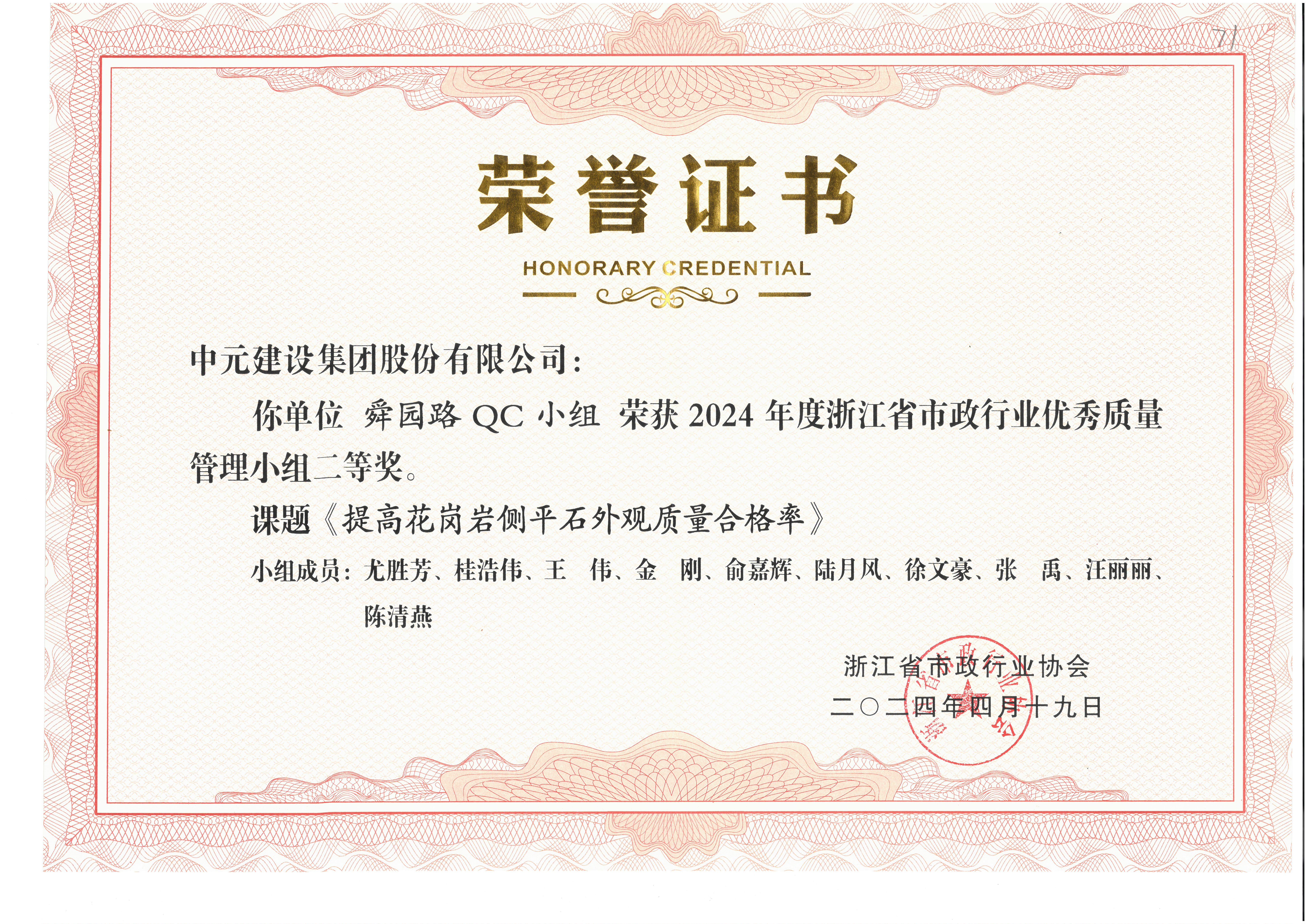 2024年度浙江省市政行业优秀质量管理小组二等奖(舜园路QC小组)