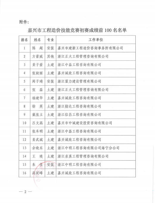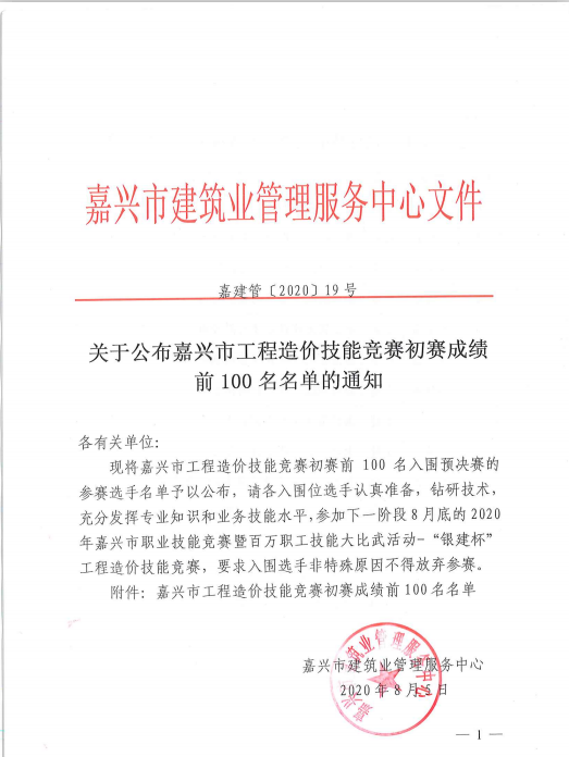 关于公布嘉兴市工程造价技能竞赛初赛成绩前100名名单的通知