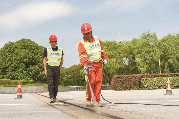 台风过后,往往气温快速回升,“这对我们来说是干活的好机会。”金滢介绍,修补路面主要用到的材料是沥青,而它是一种热拌合料,出厂温度达到165℃左右,高温有助于沥青黏合。沥青运输到现场后,在摊铺碾压之前是不得低于90℃的,“如果我们外界的温度比较低,与沥青的温差过大的话,热量快速散掉,不利于沥青强度,所以夏天对我们来讲是施工的最好季节。”